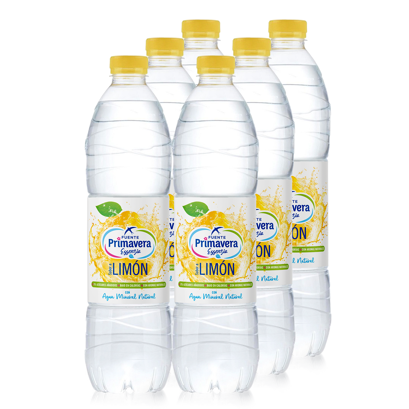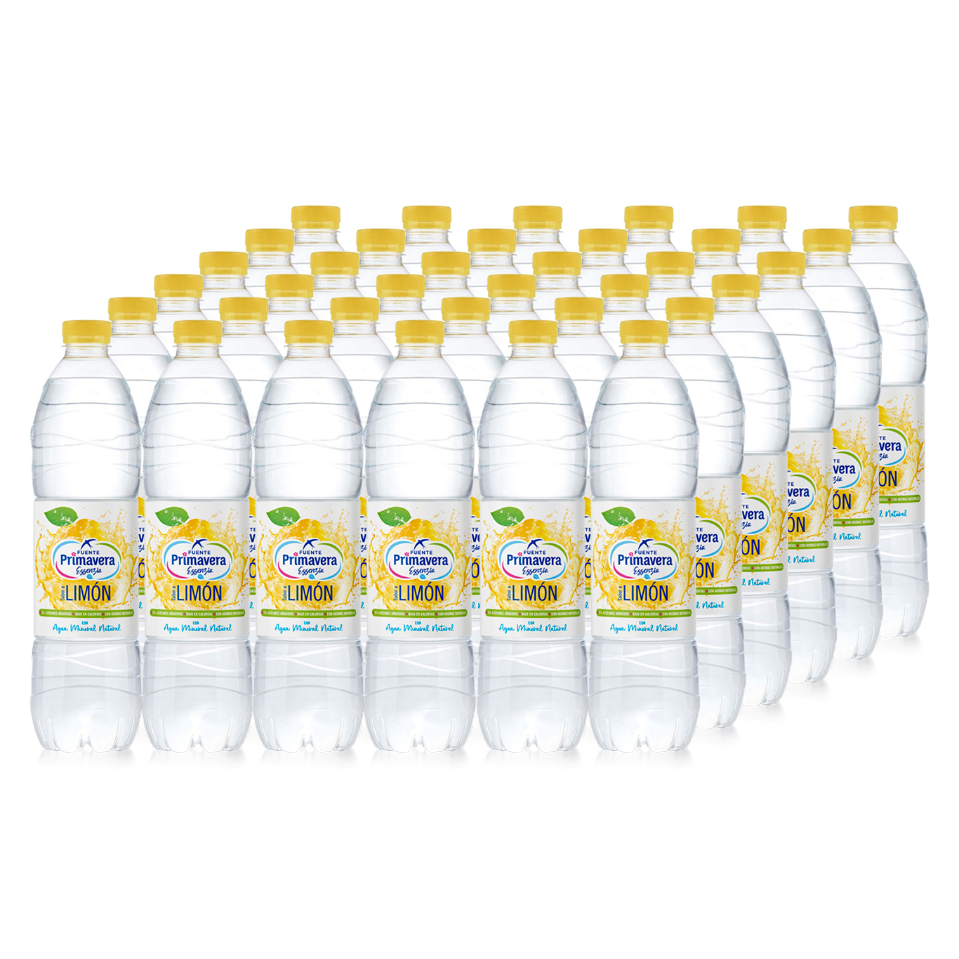 Agua mineral natural de mineralización muy débil aromatizada con sabor de limón en botella plástica de 1,5 L con tapón normal. Fuente Primavera.