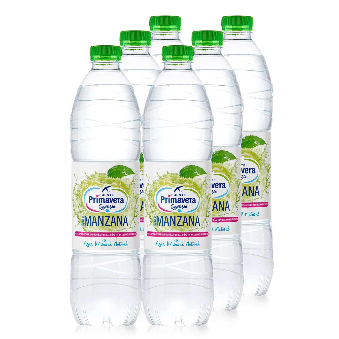Agua mineral natural de mineralización muy débil aromatizada con sabor de manzana en botella plástica de 1,5 L con tapón normal. Fuente Primavera.
